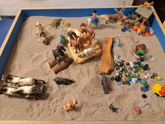 Im SpielRaum, den ich je nach Alter des Kindes mit verschiedenen Materialien und Angeboten anpasse, sowie in der Sandbild Arbeit oder an der Malwand (Malort nach A. Stern - im Keller unter dem SpielRaum) werden die Kinder aus sich heraus aktiv und zeigen intuitiv etwas von ihrer inneren Befindlichkeit.